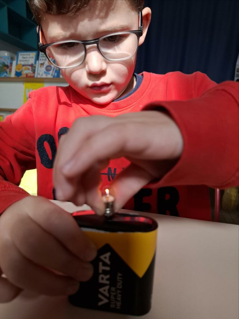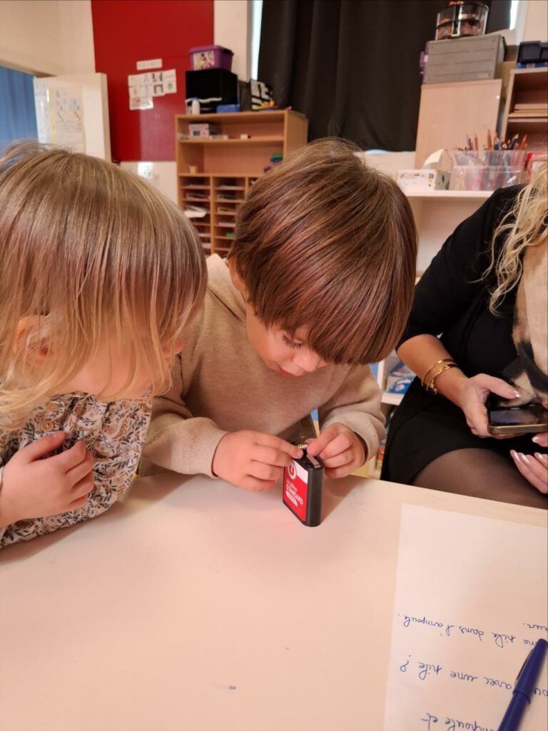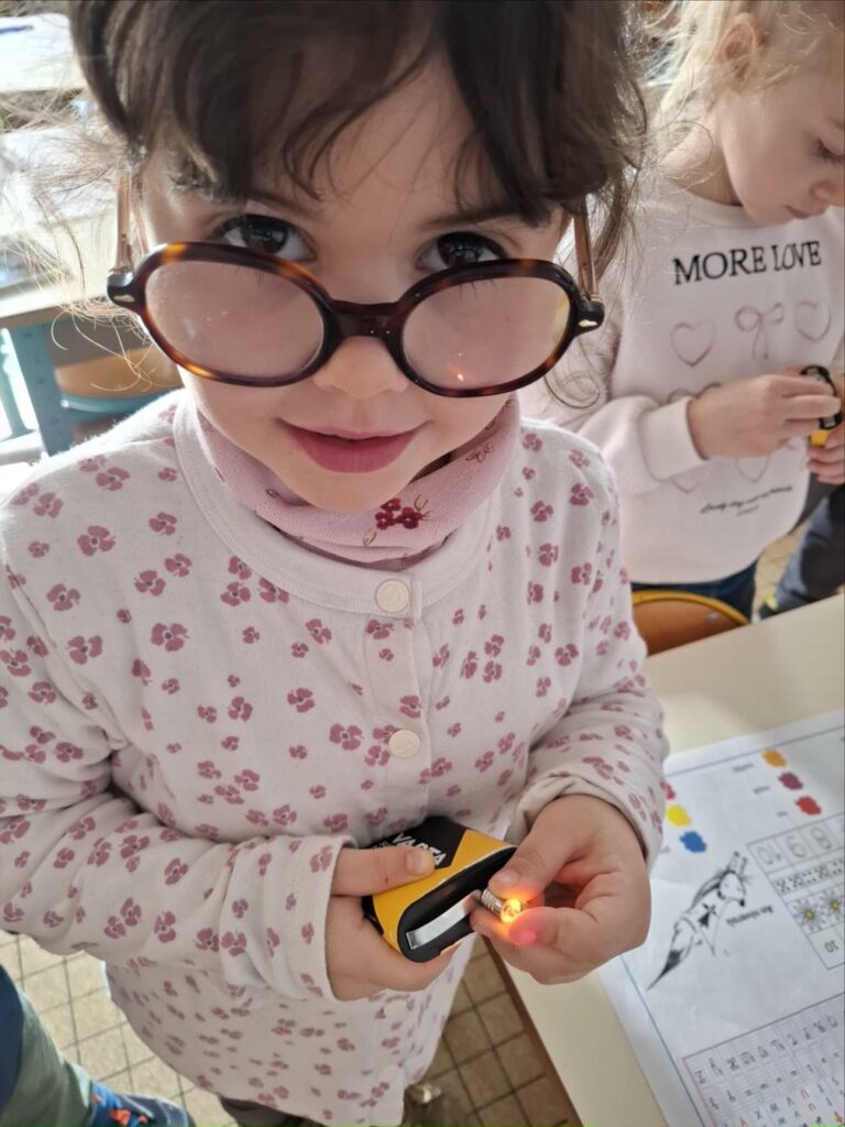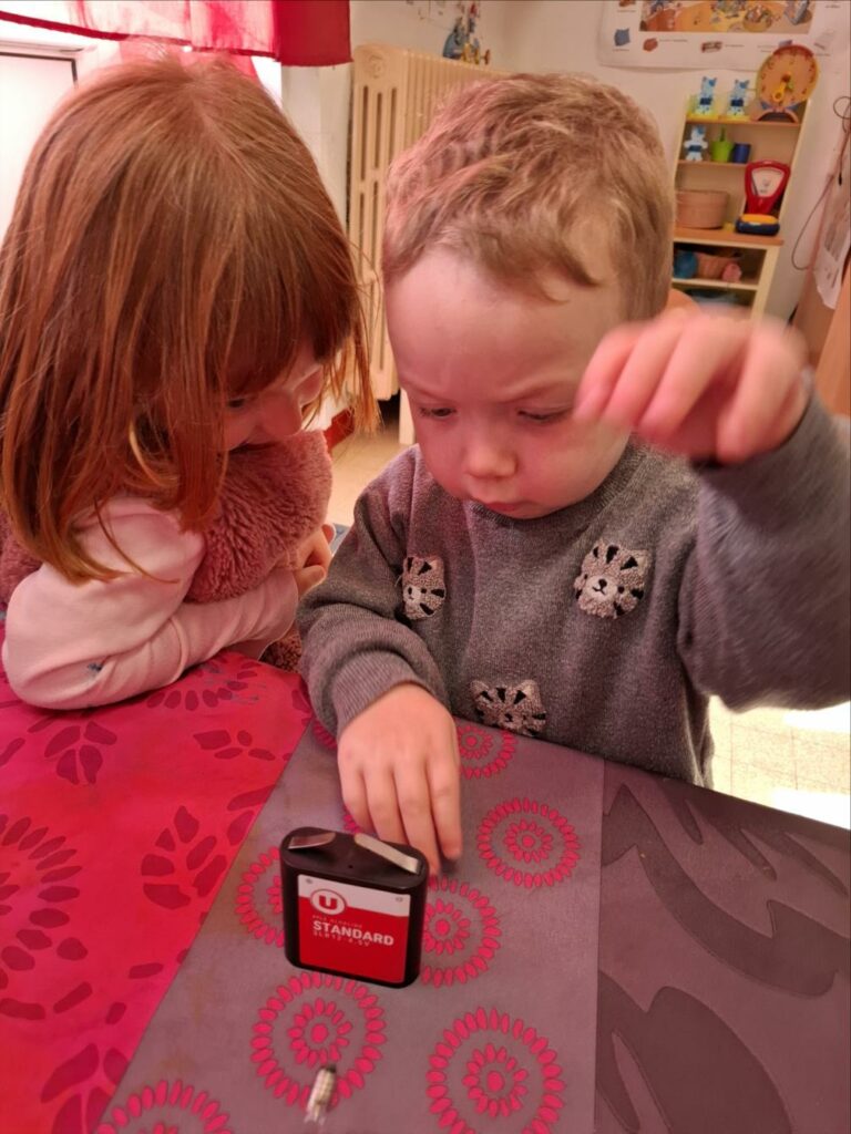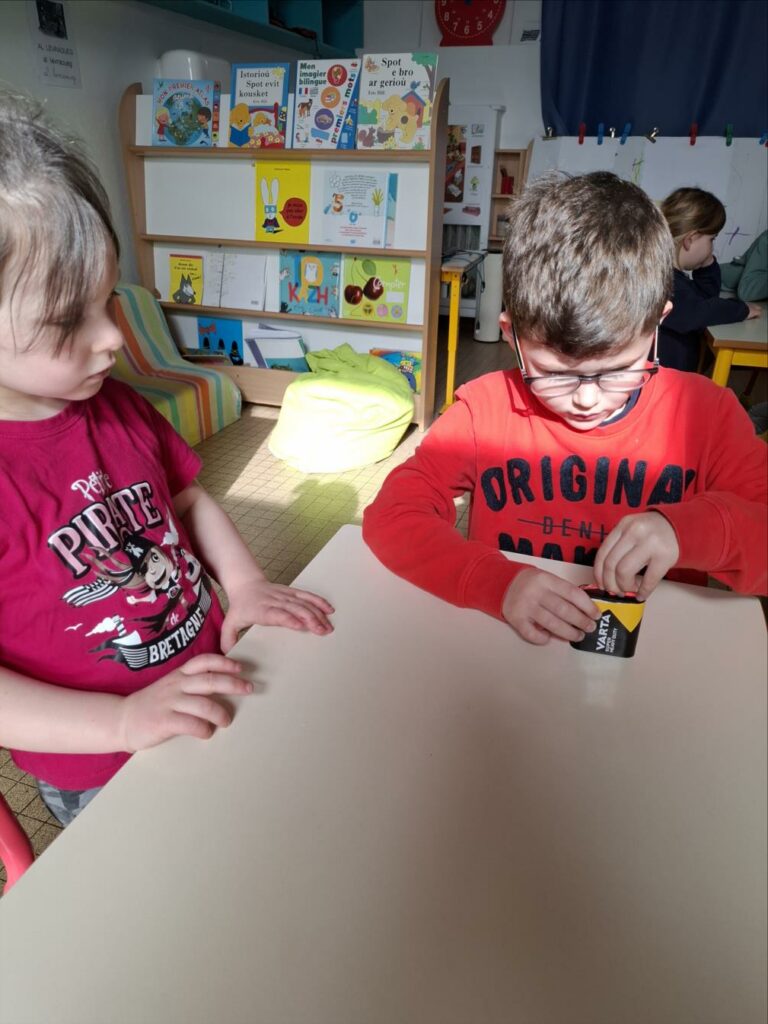 Kendelc’hañ a reomp hon skiant-prenet (nos expériences) diwar-benn an elektrisite. Est-ce que tous les objets fonctionnent avec l’électricité? Comment s’allume une ampoule? Avant de réussir, il y a eu parfois des étincelles et l’ampoule était chaude.