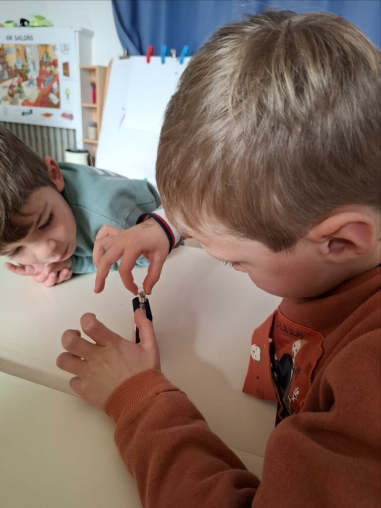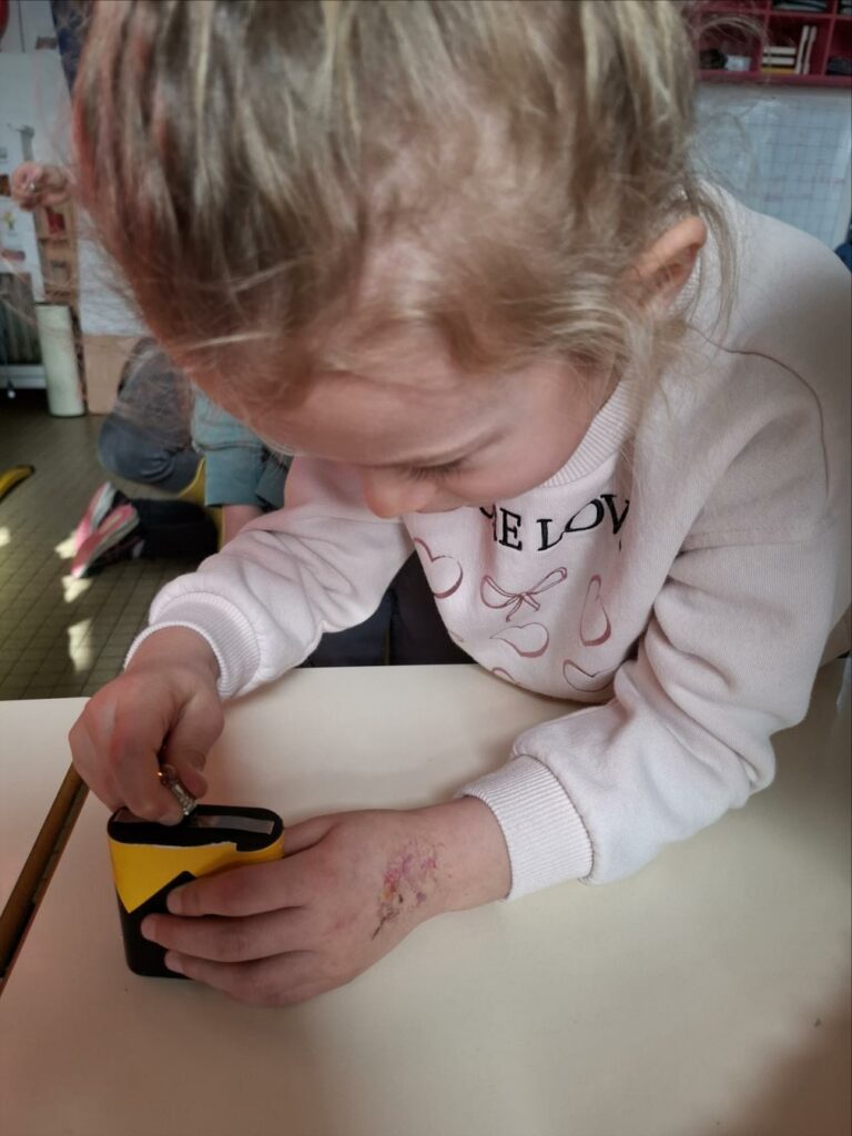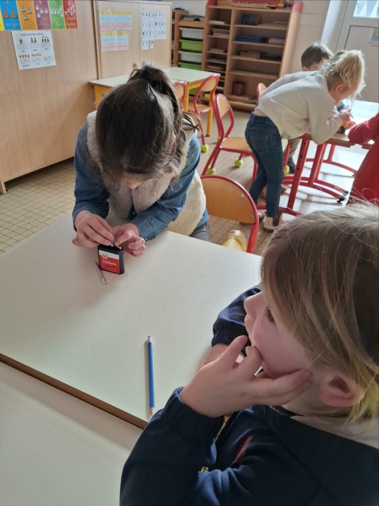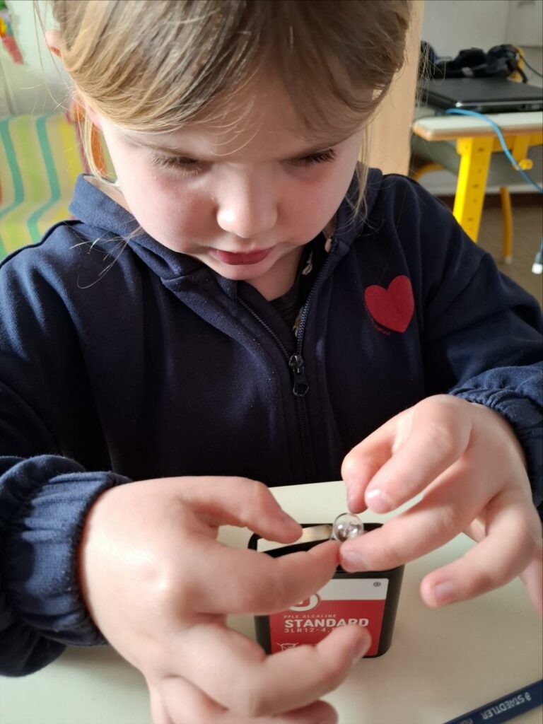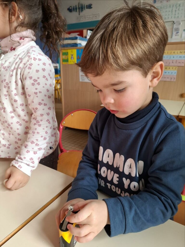Kendelc’hañ a reomp hon skiant-prenet (nos expériences) diwar-benn an elektrisite. Est-ce que tous les objets fonctionnent avec l’électricité? Comment s’allume une ampoule? Avant de réussir, il y a eu parfois des étincelles et l’ampoule était chaude.