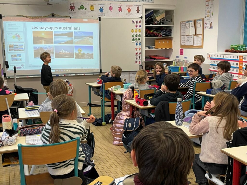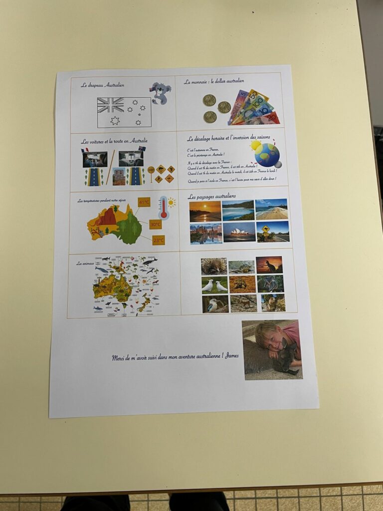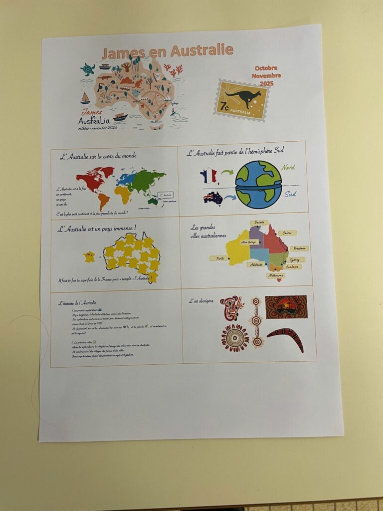 Enfin, cette semaine James nous a présenté son voyage en Australie à travers un très bel exposé. Il nous a fait découvrir les magnifiques paysages australiens, l’art aborigène, la monnaie, la faune et la flore. Un grand merci James de nous avoir fait rêver!!
