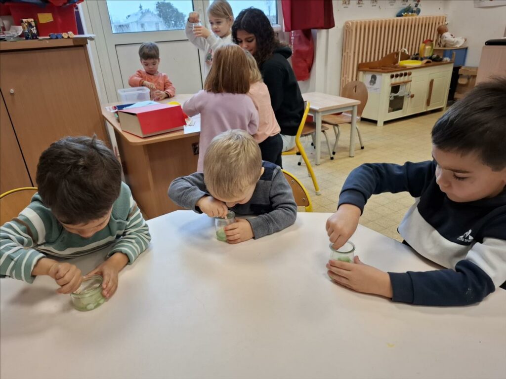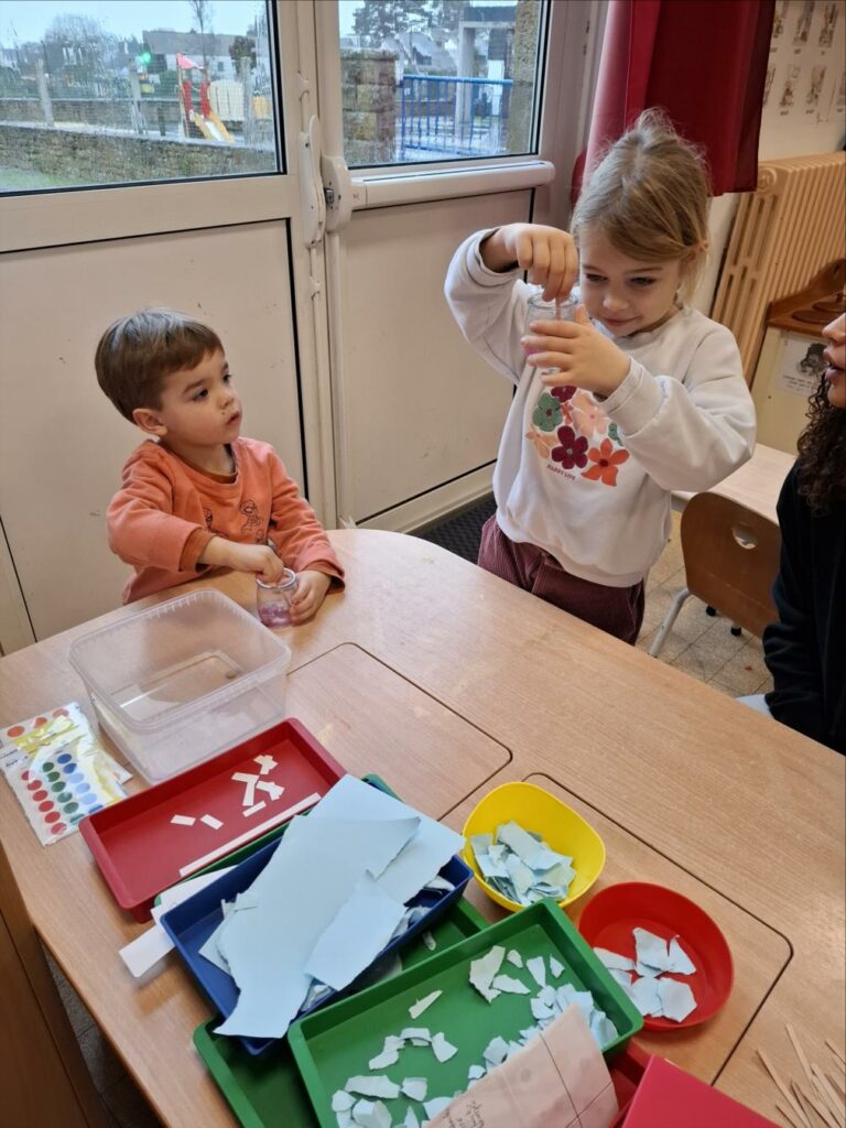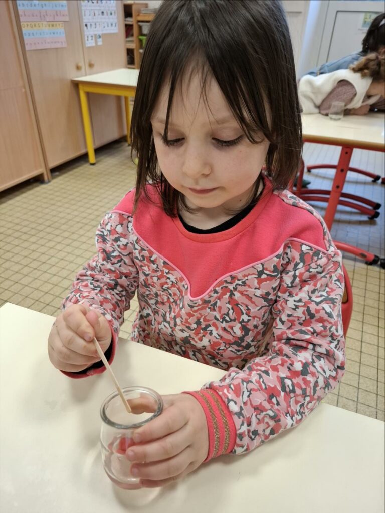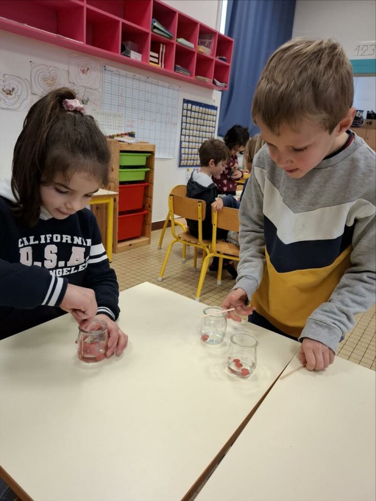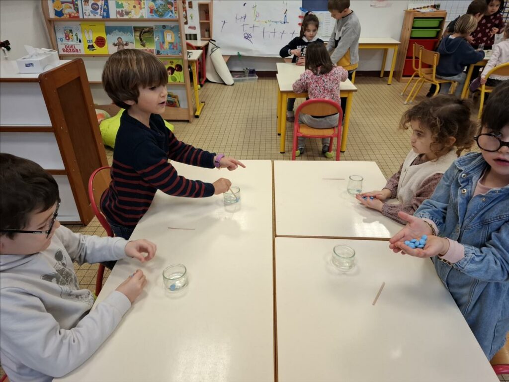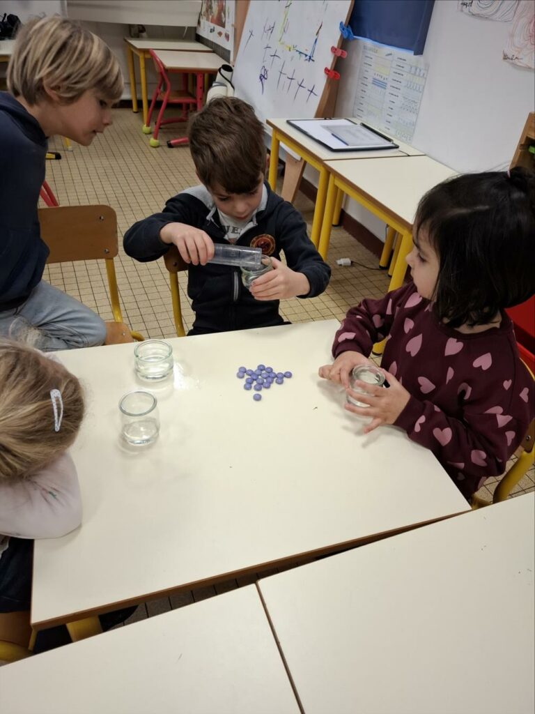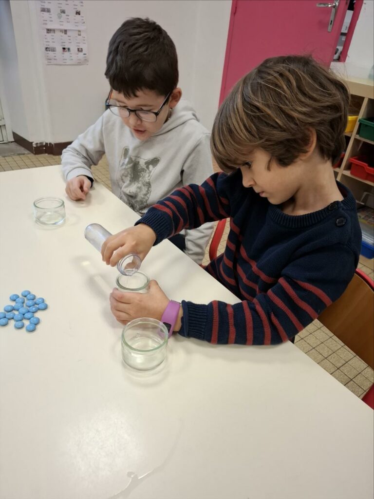 Skiantoù: cette semaine notre matinée de sciences a été consacrée à la conception d’une échelle de teinte. Lors de la dernière séance, nous avons découvert que la matière pouvait se dissoudre dans l’eau. Cette fois-ci, les élèves devaient suivre un protocole, par groupe, afin de concevoir 4 eaux colorées de teintes différentes à partir de bonbons d’une seule couleur: