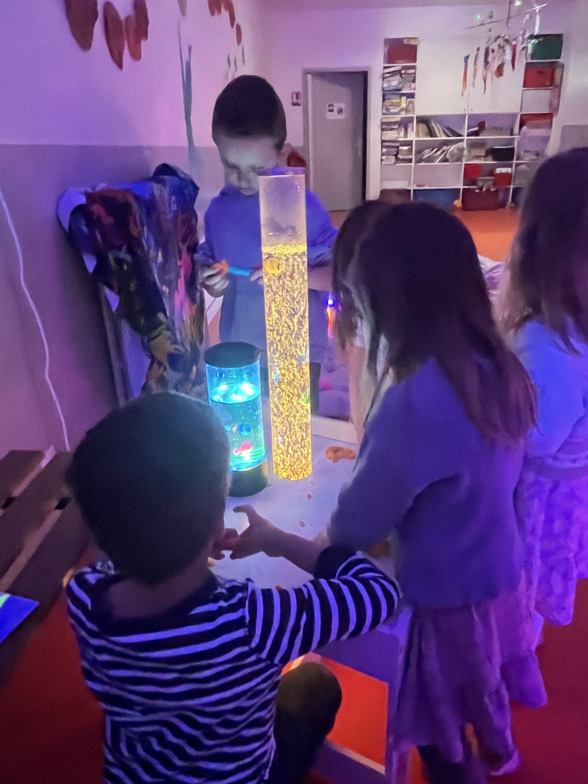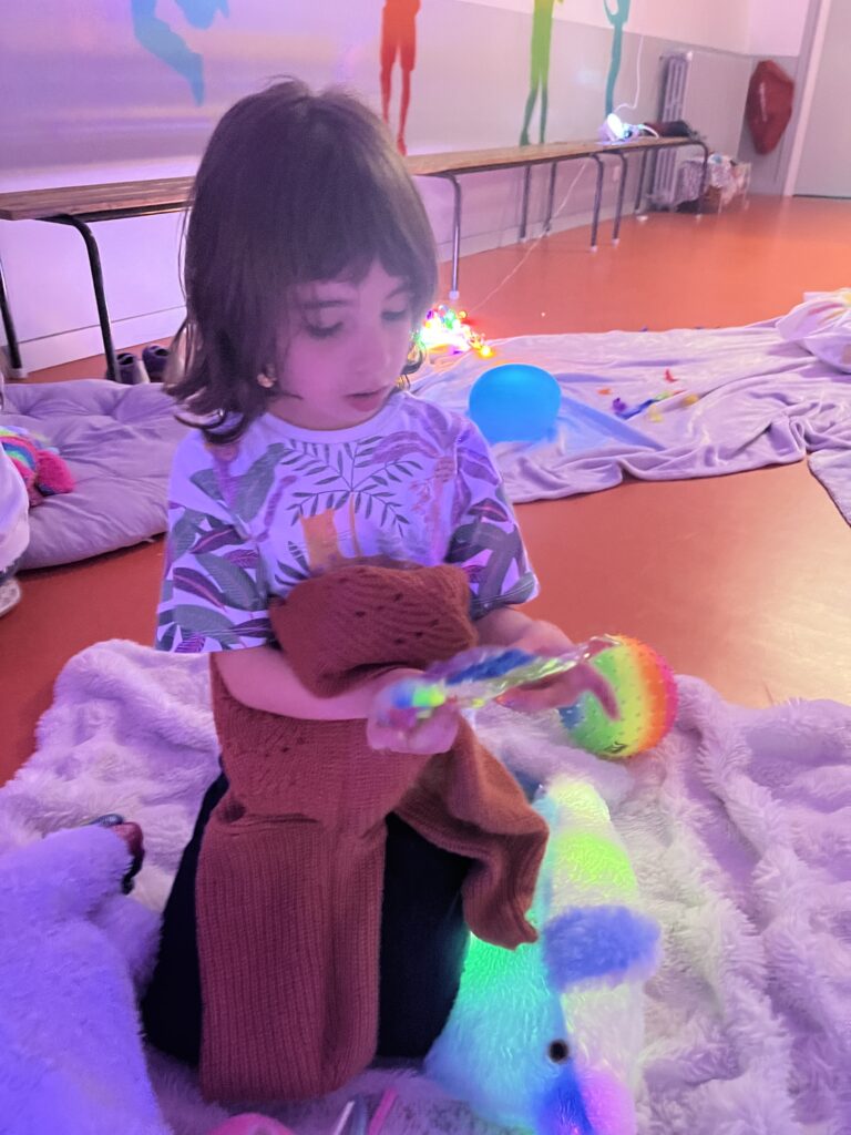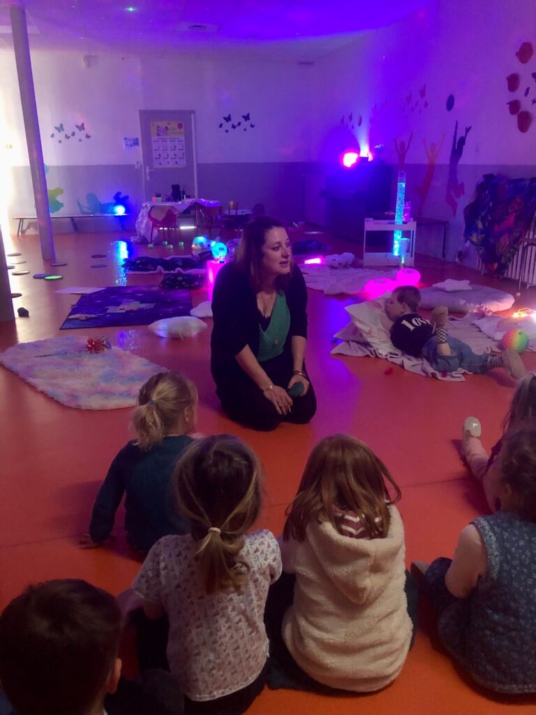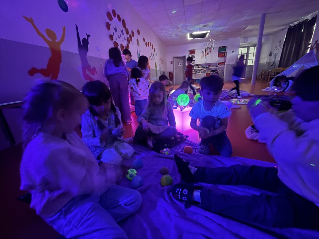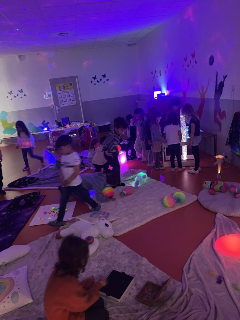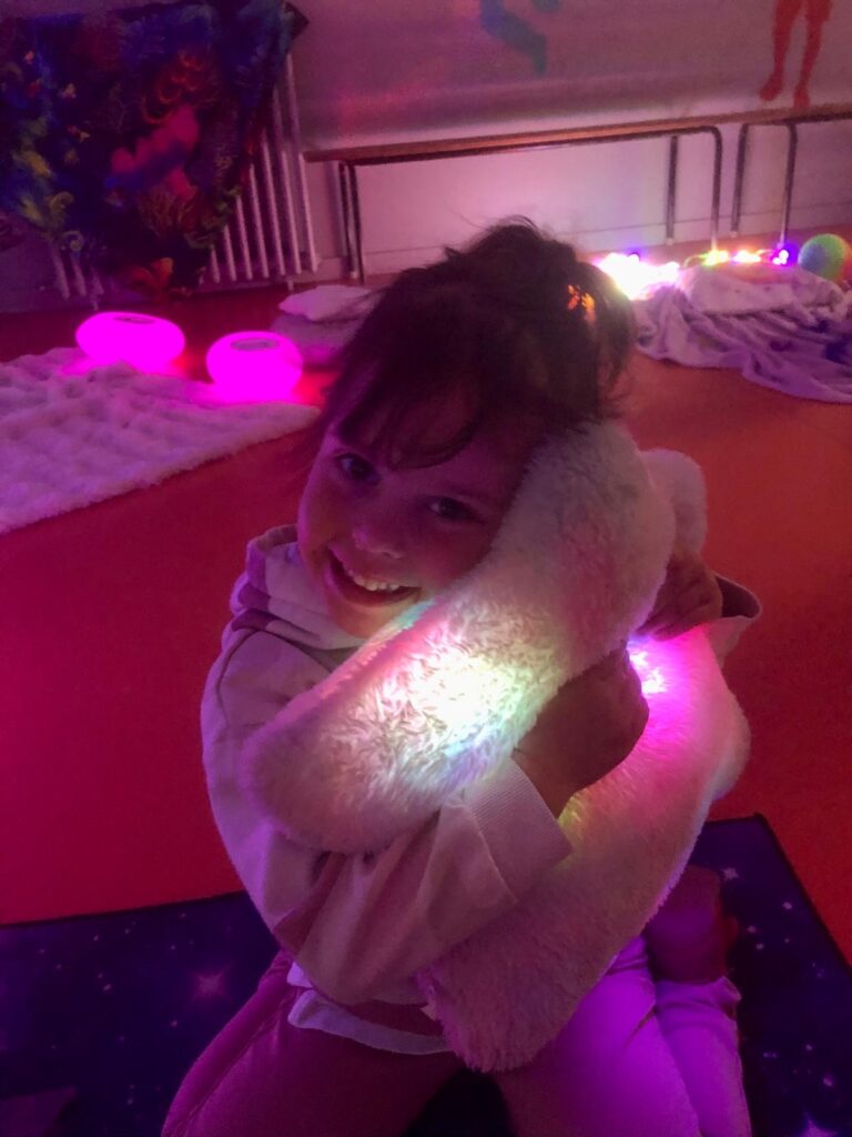 Aurore Jobard nous a proposé vendredi 10 avril un voyage sensoriel rempli de calme, de douceur et d’écoute. Dans un espace rempli de lumières fluorescentes nous avons pu explorer nos 5 sens. Merci Aurore pour ce moment magique que tu nous as permis de vivre avec nos copains.