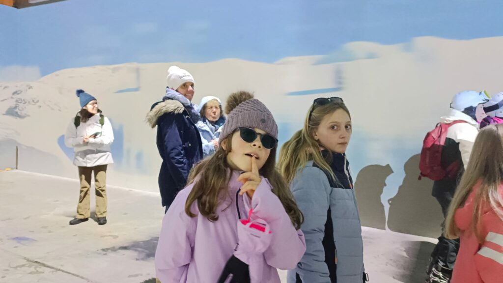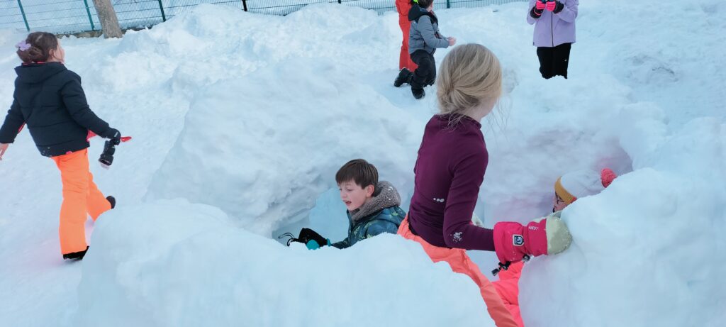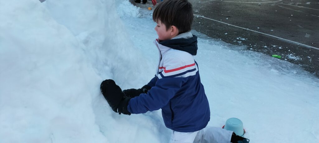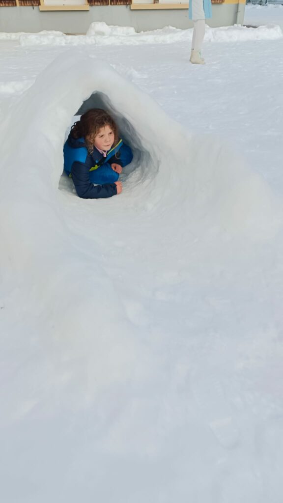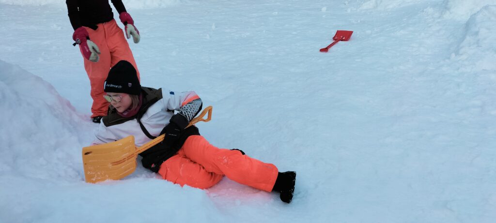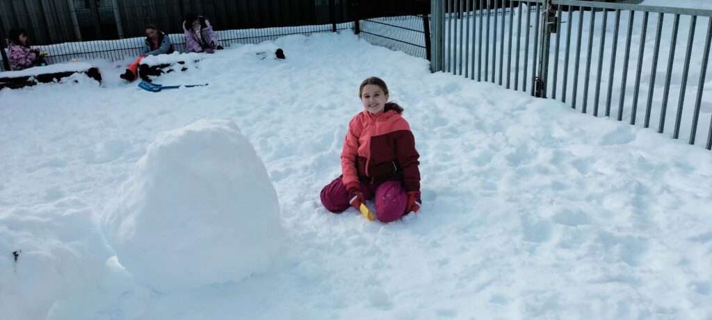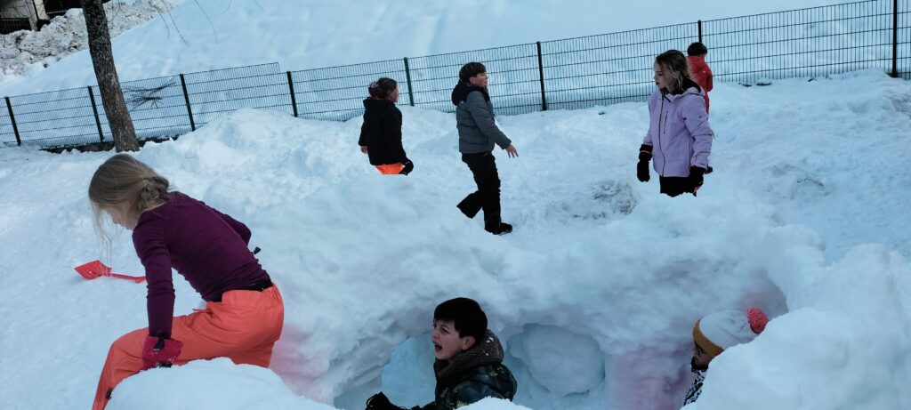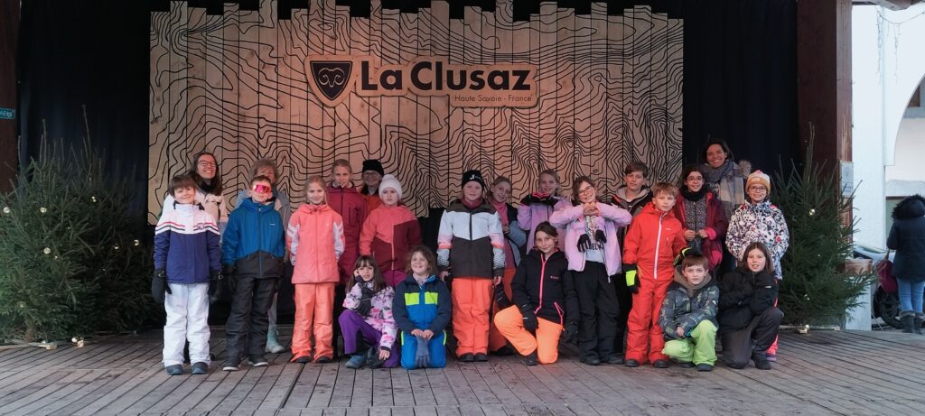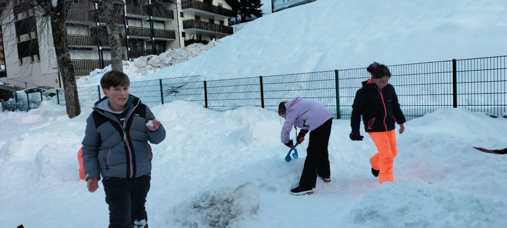 Nous sommes bien arrivés à la Clusaz. Dès notre réveil, nous avons découvert un paysage enneigé. Après avoir monté nos valises dans les chambres, nous avons apprécié un bon petit déjeuner. Ensuite, nous avons visionné un film sur la montagne dans une salle immersive. C’était trop stylé ! Après le déjeuner, nous sommes allés récupérer notre matériel de ski (casques, chaussures, bâtons et skis). Puis, nous nous sommes promenés dans le village de la Clusaz où nous avons visité une très belle église moderne. Nous avons terminé la journée par une gigantesque bataille de boules de neige. Ici les enfants fabriquent des igloos dans la neige. Nous avons pu jouer à l’intérieur. À demain pour de nouvelles aventures !