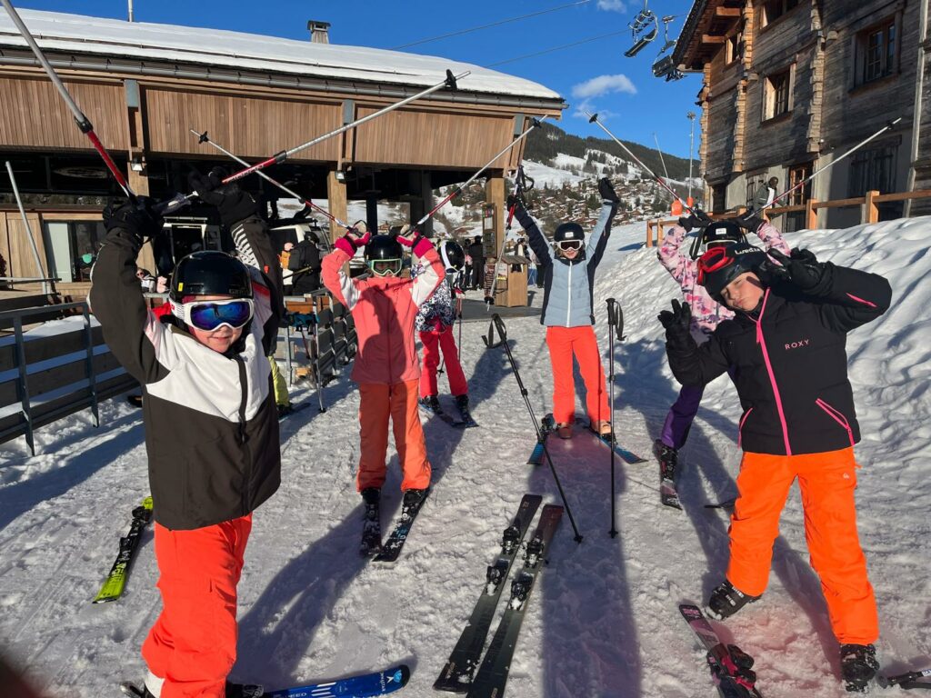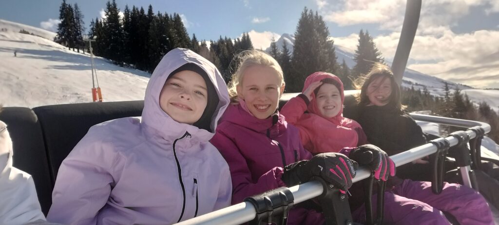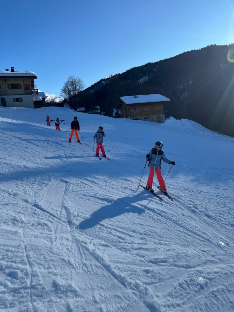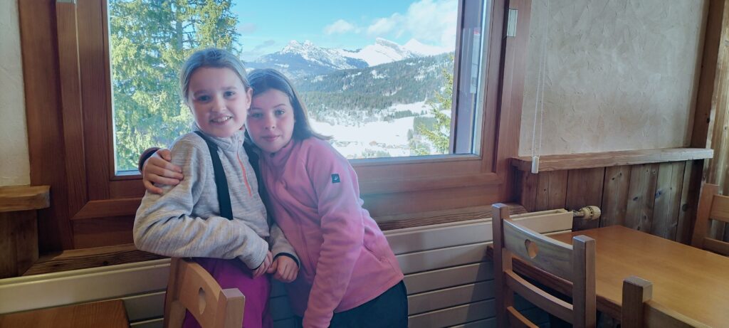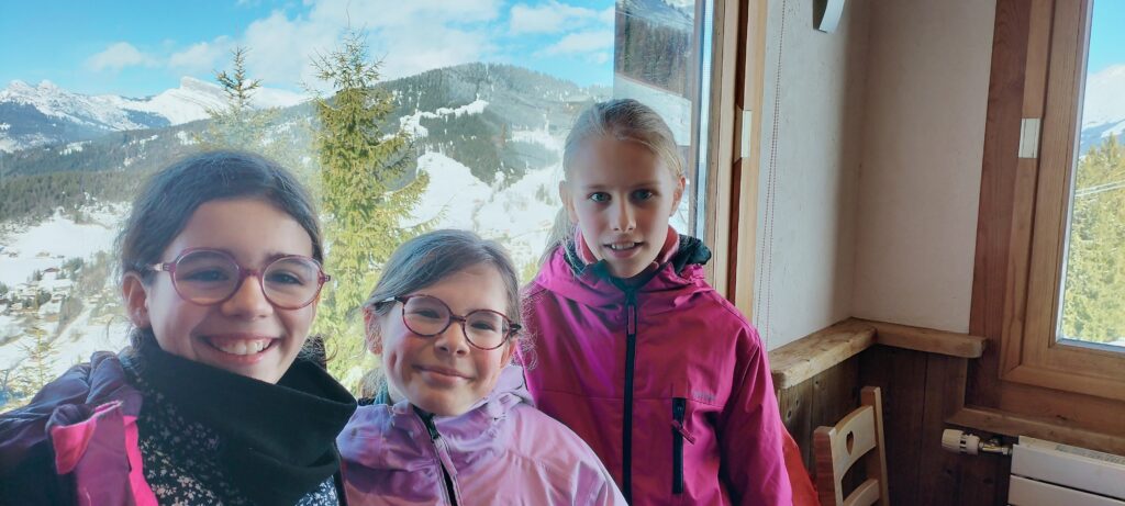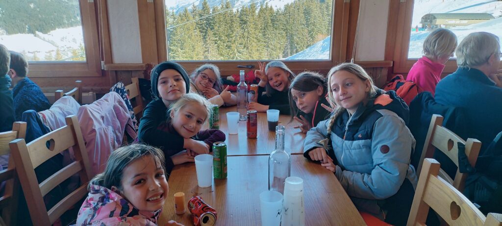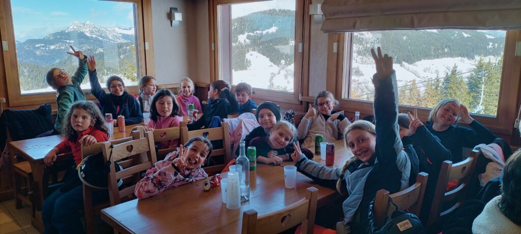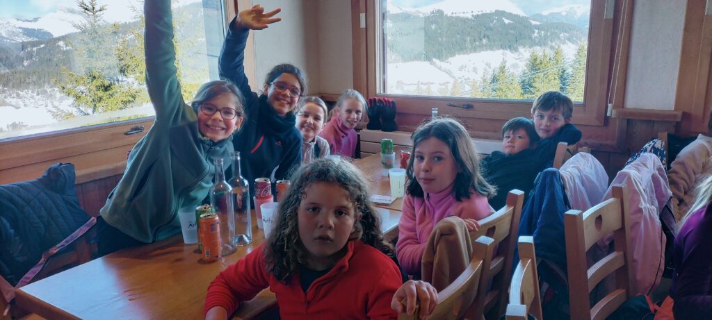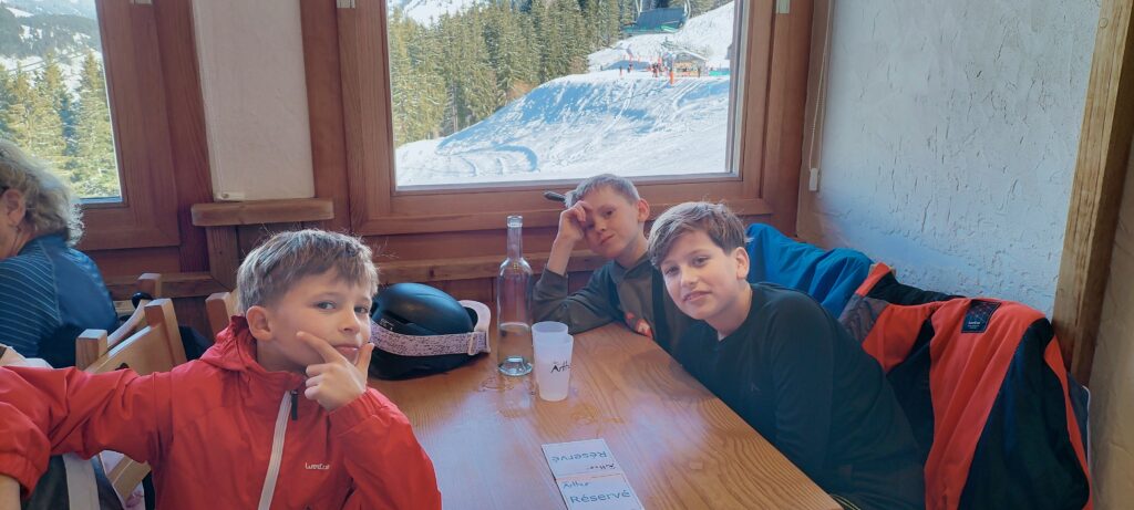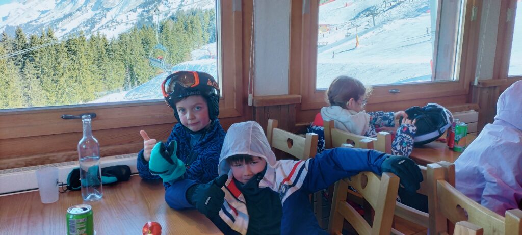 Aujourd’hui, nous avons déjeuné dans un restaurant d’altitude « Chez Arthur ». Nous avons mangé de la tartiflette et nous avons pu choisir nos boissons et nos desserts. C’était super bon! Pour nous y rendre, nous avons utilisé les télésièges. Ce matin, nous avons skié sous la neige mais cet après-midi nous étions sous un grand soleil. En rentrant du ski, nous nous sommes promenés dans un marché artisanal. Ce soir, en attendant le dîner, nous jouons et lisons tranquillement dans notre chambre.