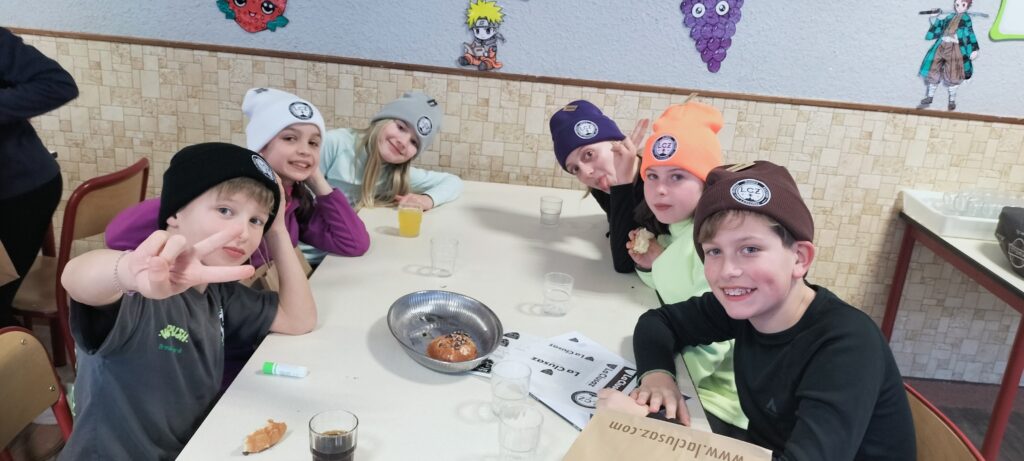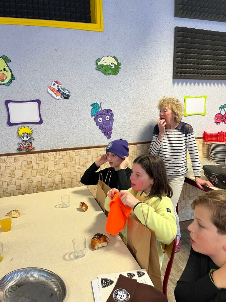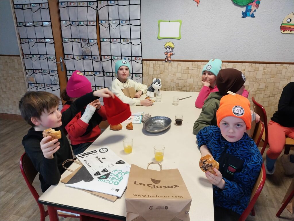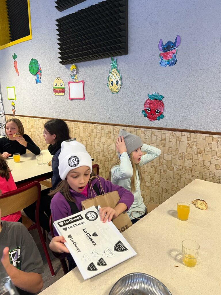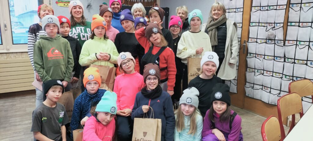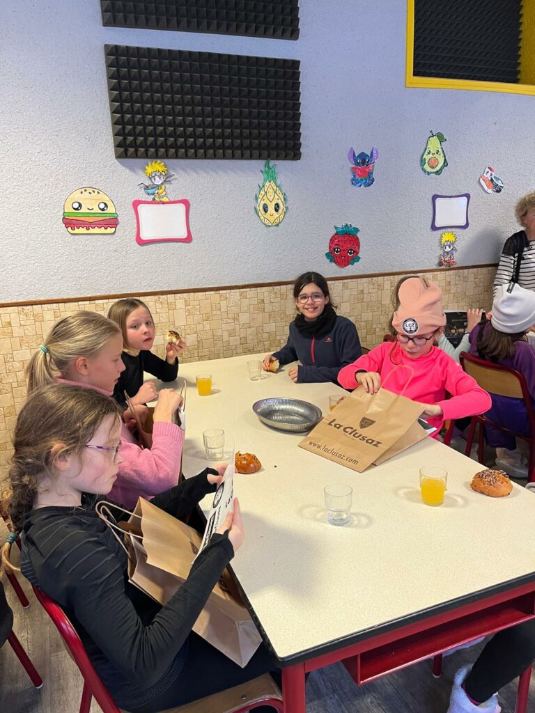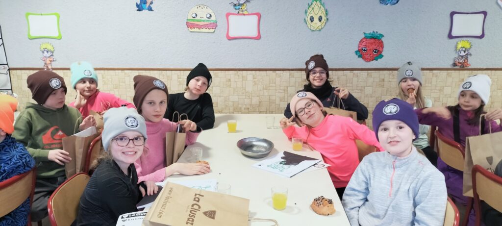 Nous avons encore passé une très chouette journée. Le comité de jumelage nous a offert un délicieux goûter avec des brioches aux pépites de chocolat et des boissons. Ils nous ont ensuite remis des cadeaux : un bonnet, un livre et des autocollants. Nous avons bien progressé au ski et nous nous amusons bien. Nous avons pu assister au championnat d’Europe de Freestyle et c’était très impressionnant. Ce soir, nous allons déguster la raclette offerte par le comité de jumelage.