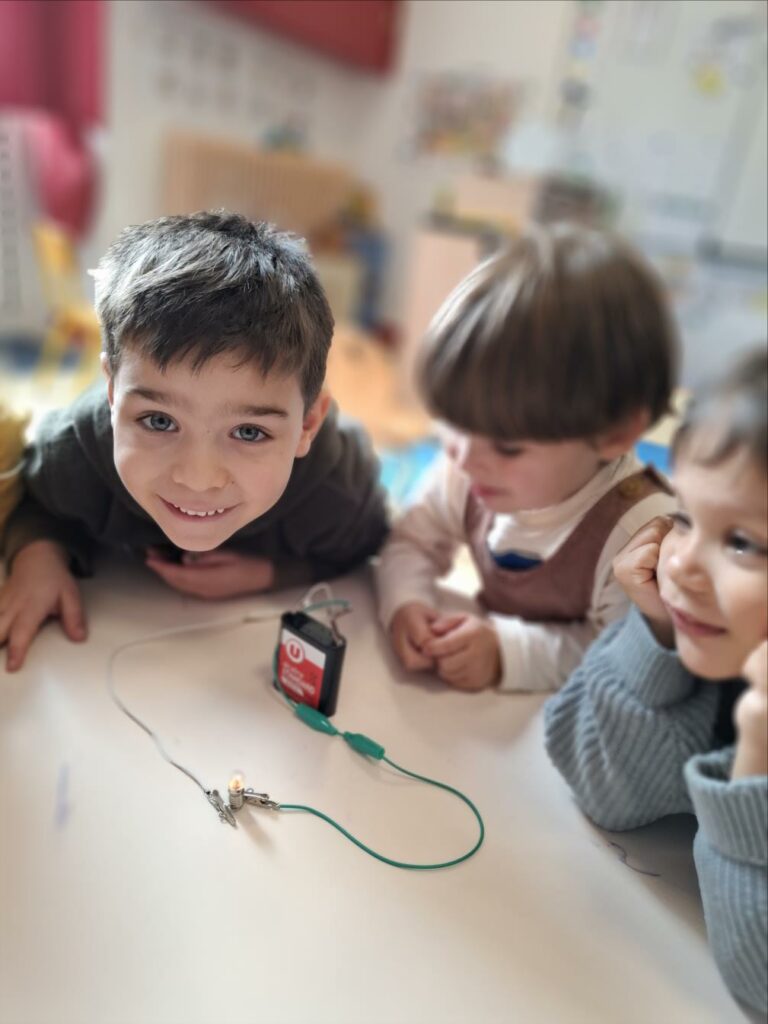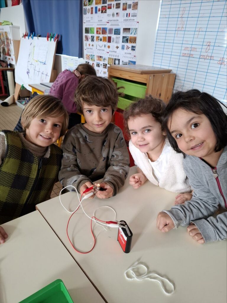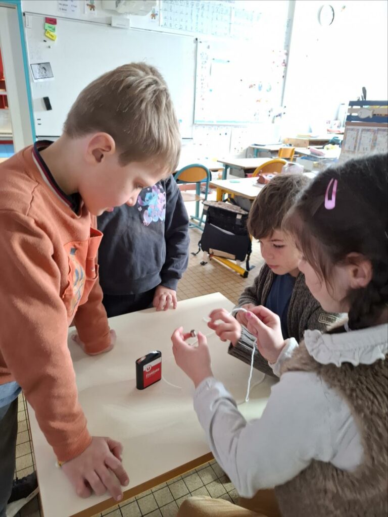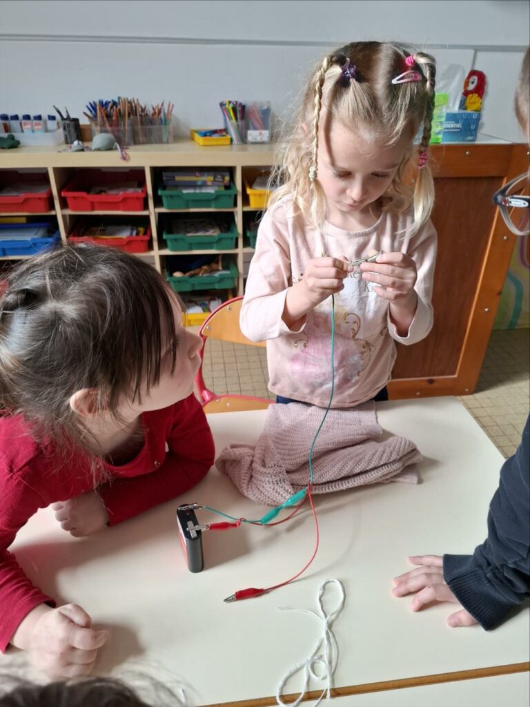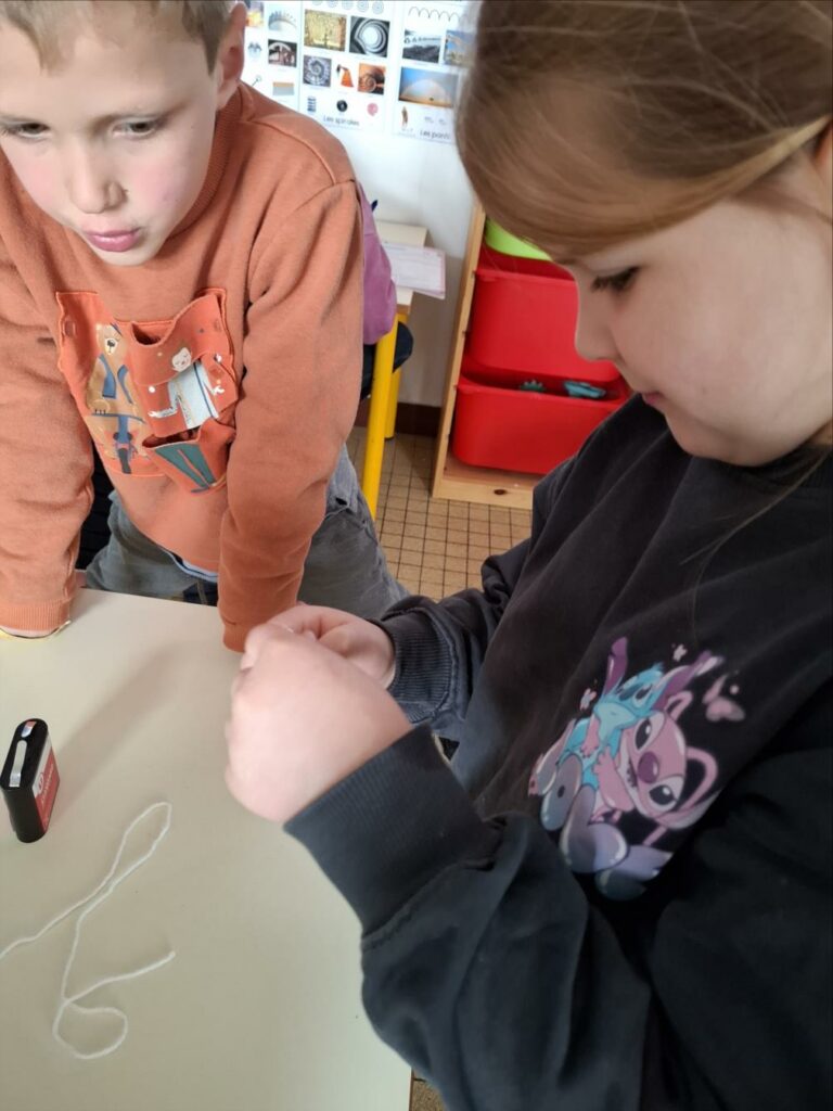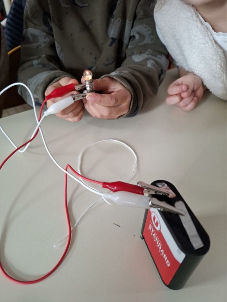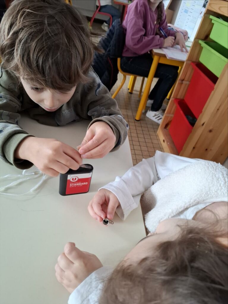 Nous poursuivons nos ateliers scientifiques: l’électricité. Comment allumer une ampoule à distance d’une pile?