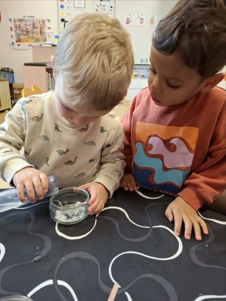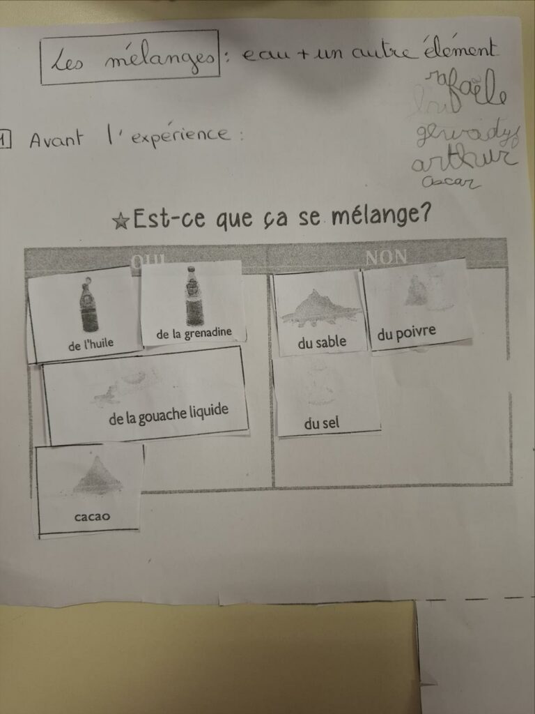 Expérience sur les mélanges et les états de l’eau; nous échangeons et vérifions nos hypothèses par l’expérience:
