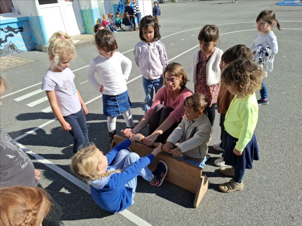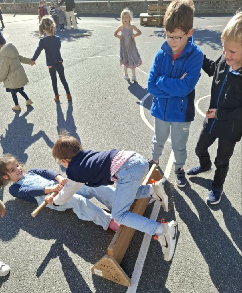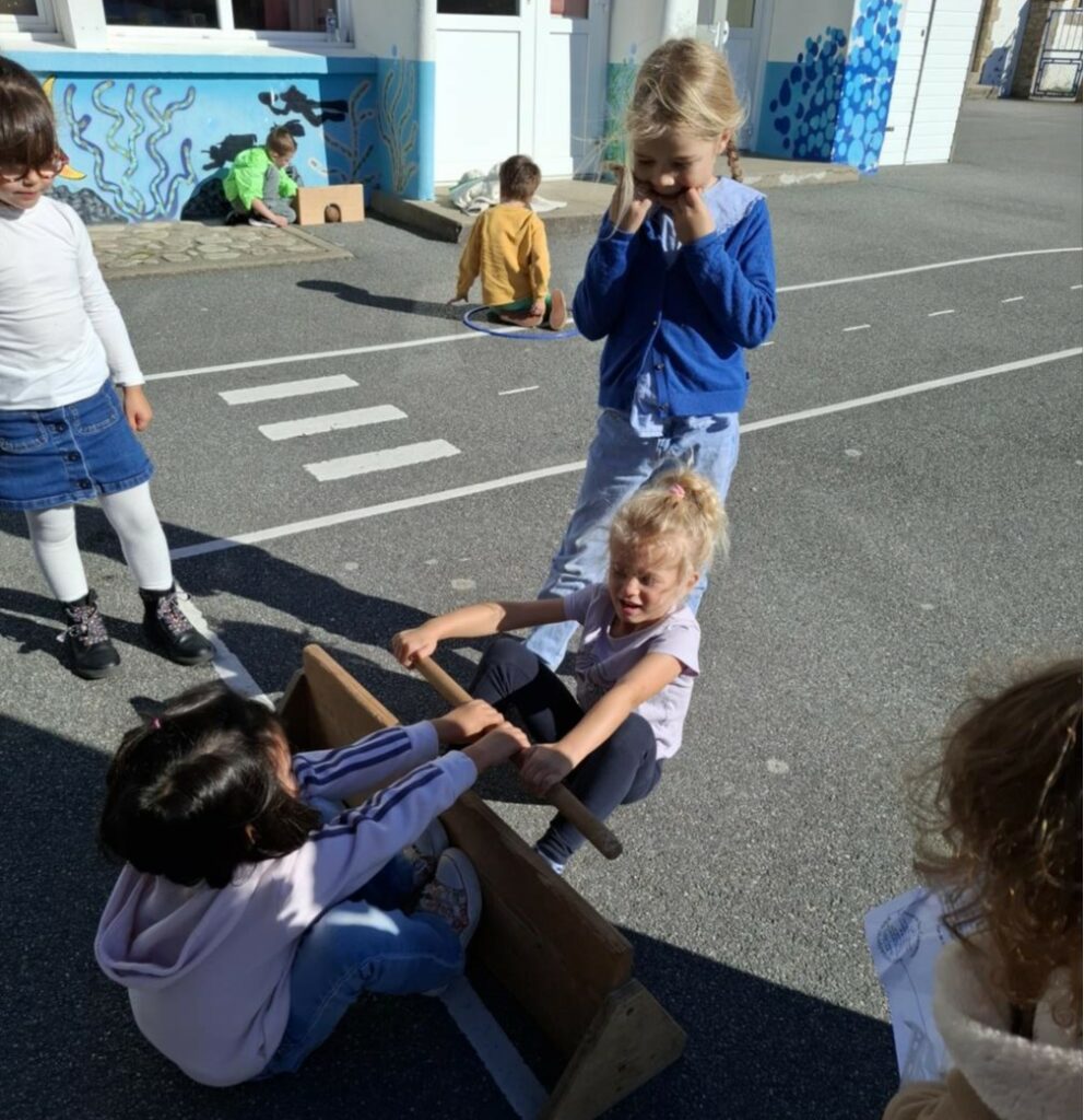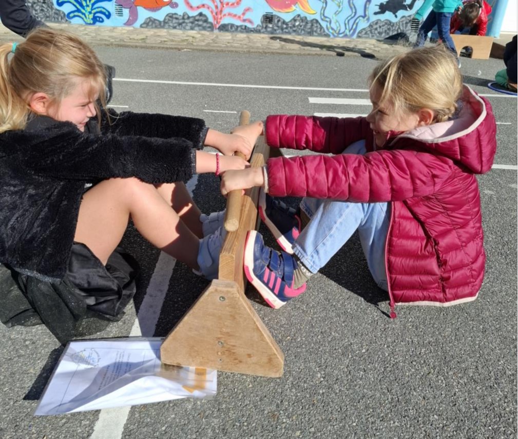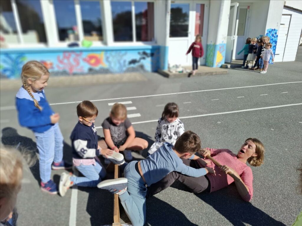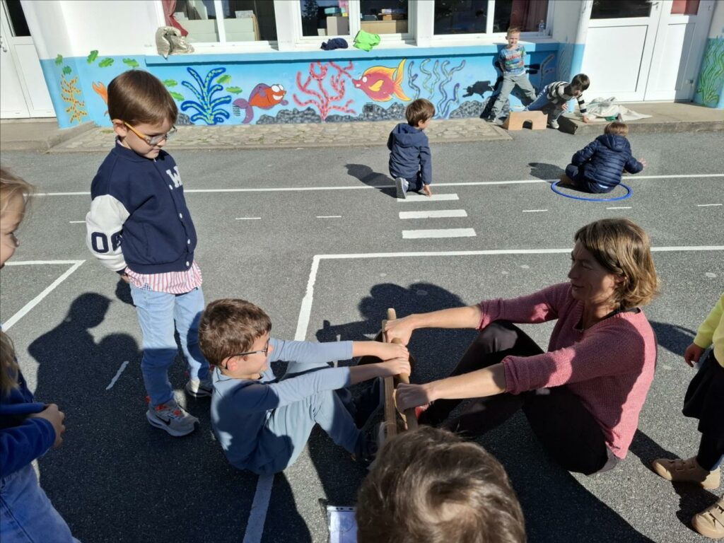 Nous avons fêté la St Michel lundi! Les enfants ont découvert des jeux bretons comme le « bazh-yod », qui a eu un franc succès. Le but du jeu est simple, deux partenaires sont assis par terre, face à face. Il s’agit d’essayer d’arracher le bâton à l’adversaire, ou encore de tirer celui-ci vers soi. Le « bazh yod » (ou bâton à bouillie) tire son image de la préparation de la bouillie d’avoine qui nécessitait l’utilisation d’un bâton court et solide.