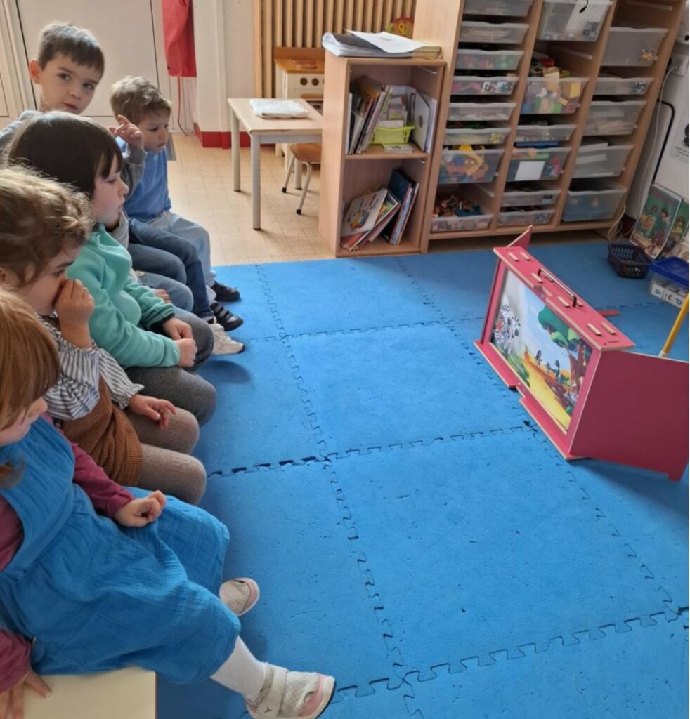 Nous aimons écouter des histoires et cette semaine la maîtresse nous a fait découvrir le kamishibai. C’est un petit théâtre d’images.